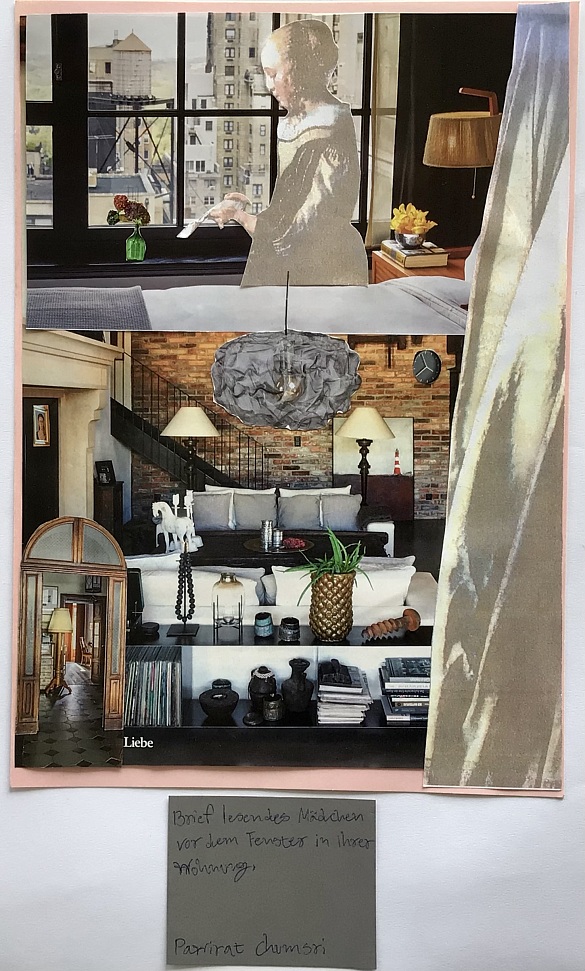 Zugrunde lag die kunstgeschichtliche Rezeption des Bildes von Jan Vermeer van Delft „brieflesendes Mädchen am offenen Fenster“. Die Dresdener Gemäldegalerie restaurierte mit überraschenden Ergebnissen das Bild und inspirierte die SchülerInnen. Sie gestalteten eine Collage mit neuem Hintergrund für das brieflesende Mädchen.