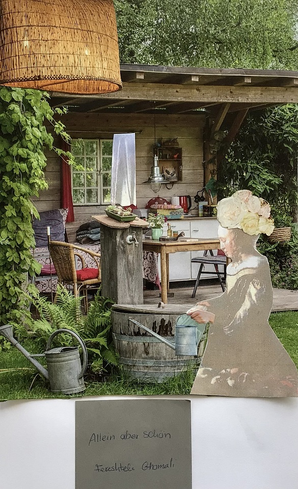 Mit der Technik der Collage entwickelten die SchülerInnen im Anschluss eine neue Bildgeschichte. Es musste das Mädchen und der Vorhang auf allen Bildern sein und ein neuer Titel sollte vergeben werden.. Ansonsten herrschte künstlerische Freiheit.